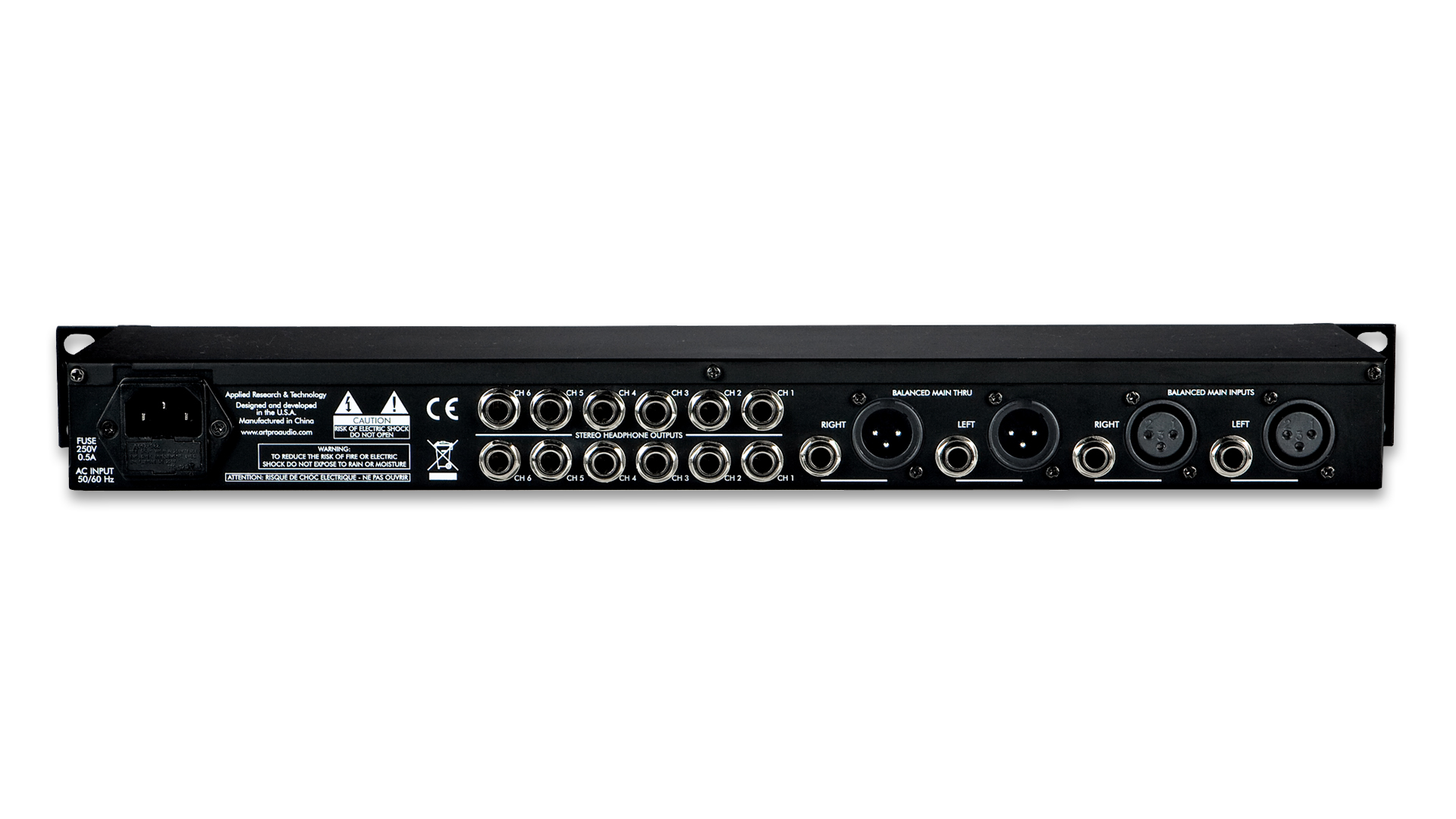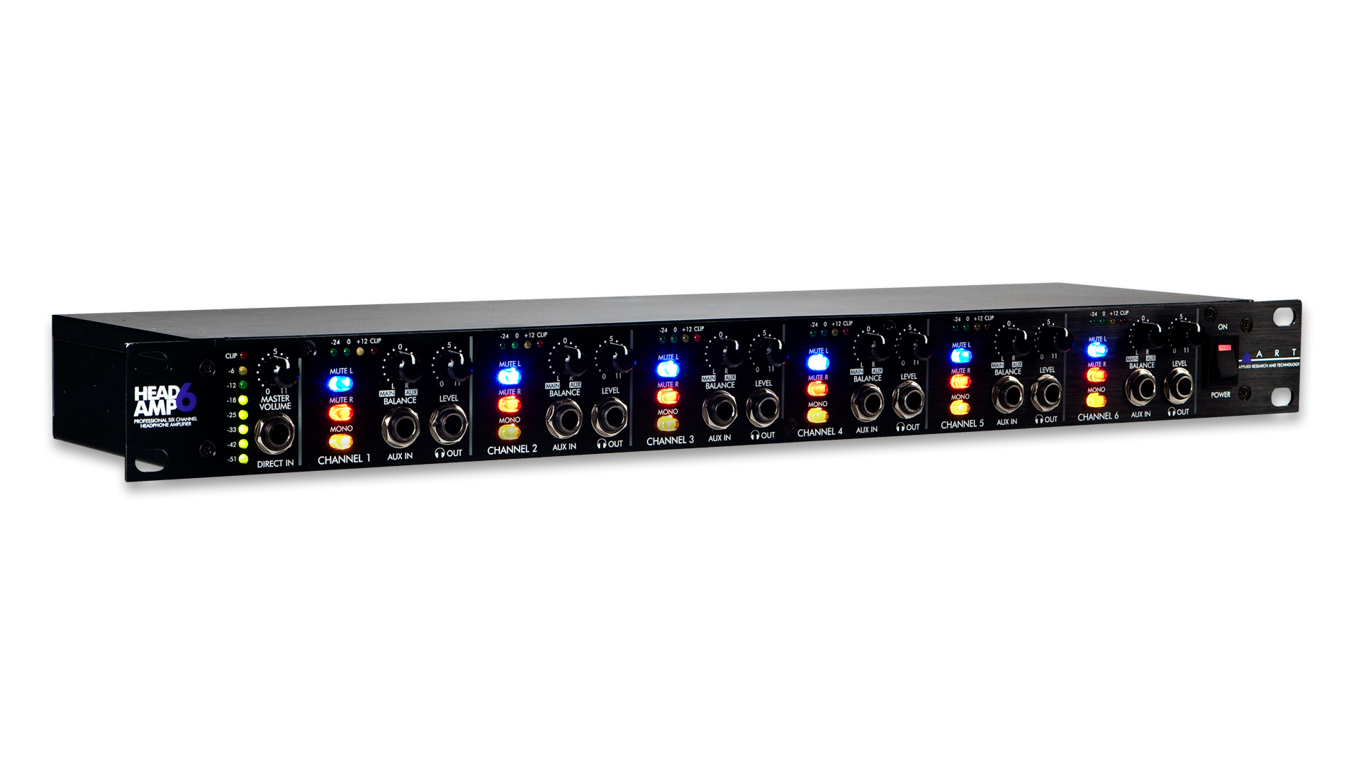 Each output channel includes one front and two rear panel stereo 1/4-inch TRS head-phone jacks for ease of installation and quick patching capability. Mono, Mute L, and Mute R select buttons and on each channel select between four operating modes; 1) Stereo, 2) Mono Left, 3) Mono Right, 4) Mono Both (Left & Right) for versatile monitoring solutions. Independent output level controls on each channel personalize monitoring levels.