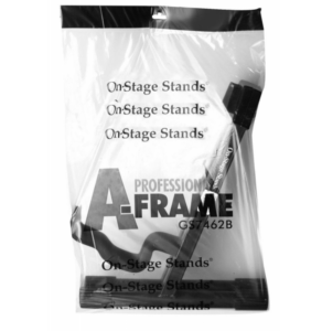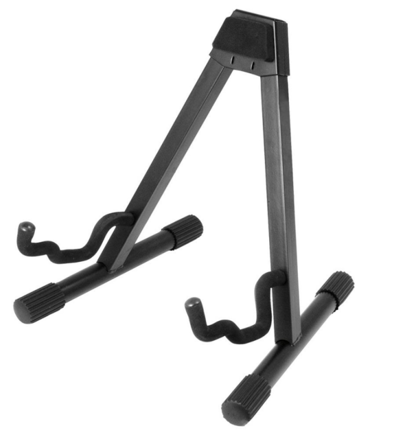 Holds either an acoustic or electric guitar, or a desktop mixer. 1 x 1” Tubing, patented stepped yoke and tilt-back design. Folds flat. Black finish, black Velveteen rubber.