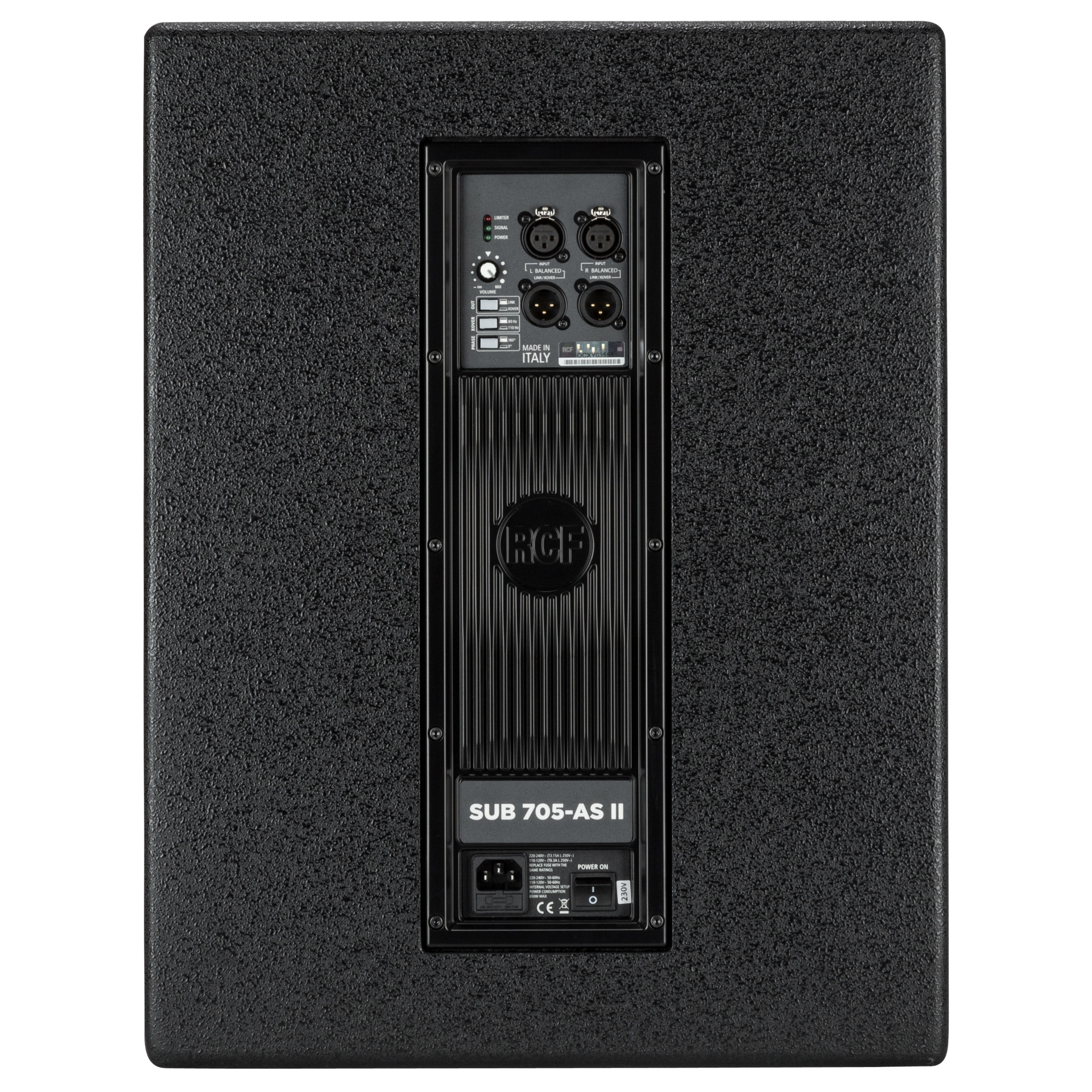 The SUB 705-AS II is a compact and powerful bass reflex subwoofer. It is equipped with a 15” high power woofer with 3” voice coil, powered by a 1400 Watt digital amplifier in a robust plywood housing with deep and punchy tuning for a powerful bass. Thanks to the built-in digital stereo crossover (DSP) with adjustable crossover frequency, it can be easily and quickly set up with a satellite speaker. The SUB 705-AS II easily combines with 12” and 15”, ideal for RCF ART and D-Line Series.