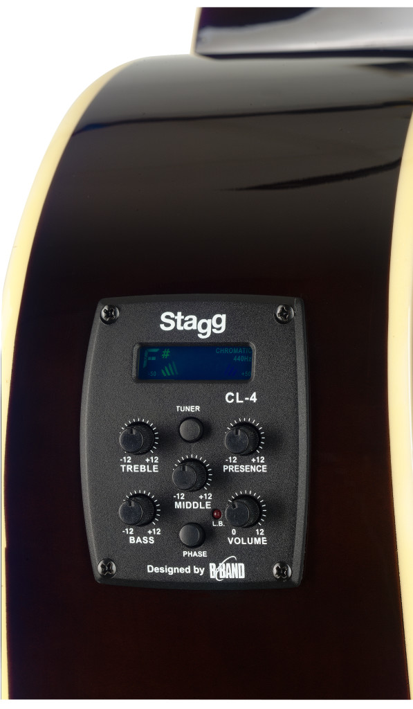 - Electronics: Under saddle B-Band transducer with preamp featuring built-in chromatic tuner, volume, presence, bass, medium and treble control, low battery indicator and 6.35 mm (1/4″) output jack